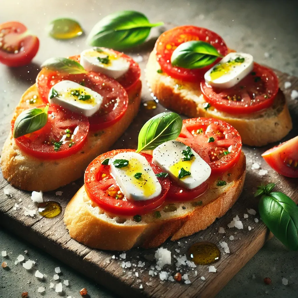 방법: 바게트를 슬라이스하고 오븐에서 살짝 구워 바삭하게 만든 후 토마토와 모짜렐라를 얹고 바질 잎을 올려줍니다. 올리브오일을 뿌려 마무리합니다.