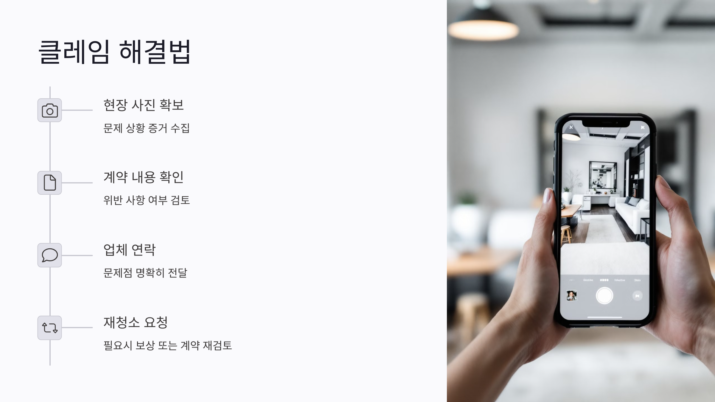 현장 사진을 확보하고 계약 내용을 확인한 후 청소 업체에 문제를 명확히 전달해야 합니다. 계약 내용에 위반 사항이 있으면 재청소나 보상을 요구할 수 있습니다. 문제가 반복되면 계약 해지를 고려해야 합니다.