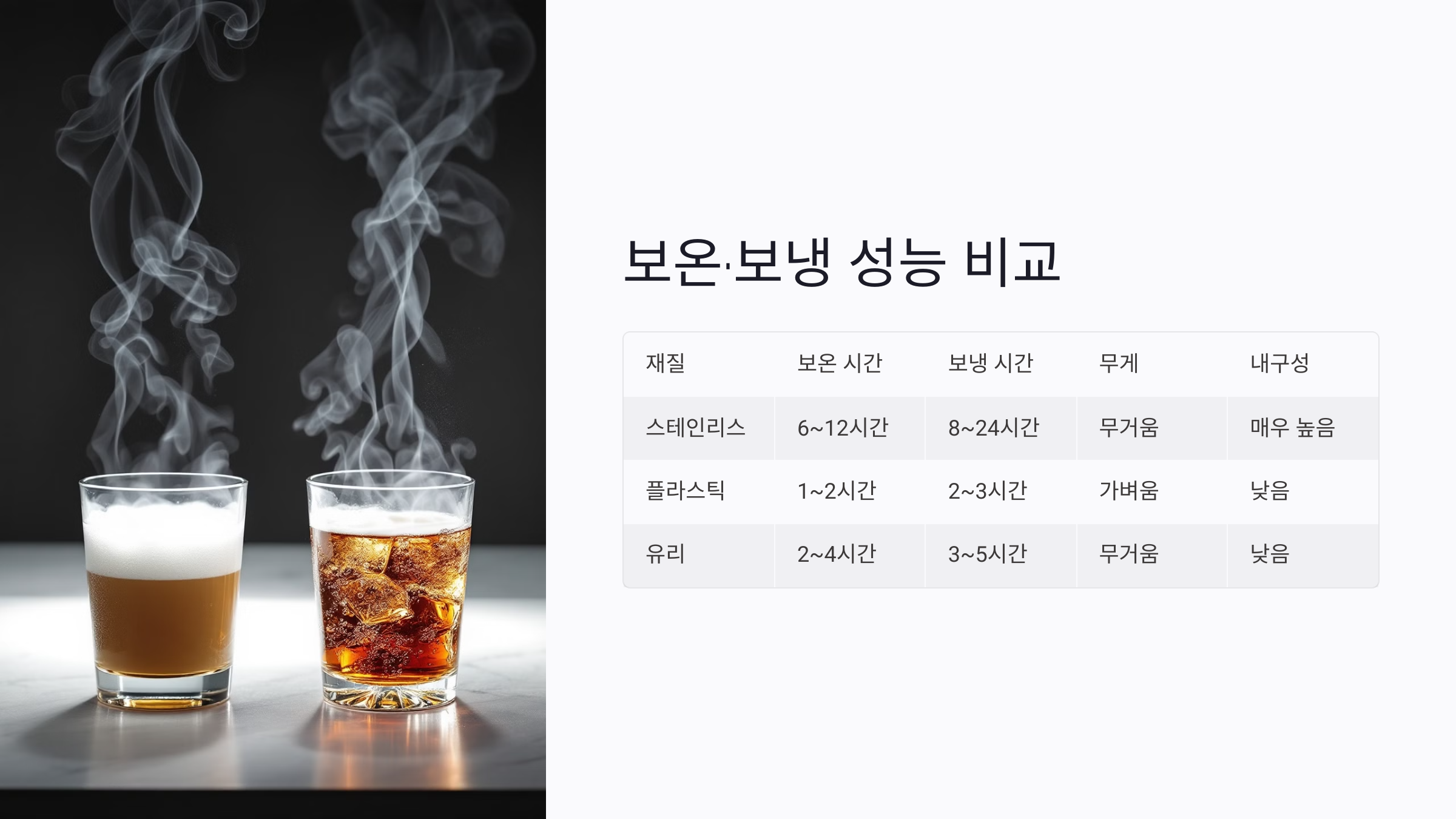 텀블러의 보온·보냉 기능은 사용 목적에 따라 선택의 중요한 기준이 됩니다. 재질별 성능은 아래와 같이 비교할 수 있습니다.
