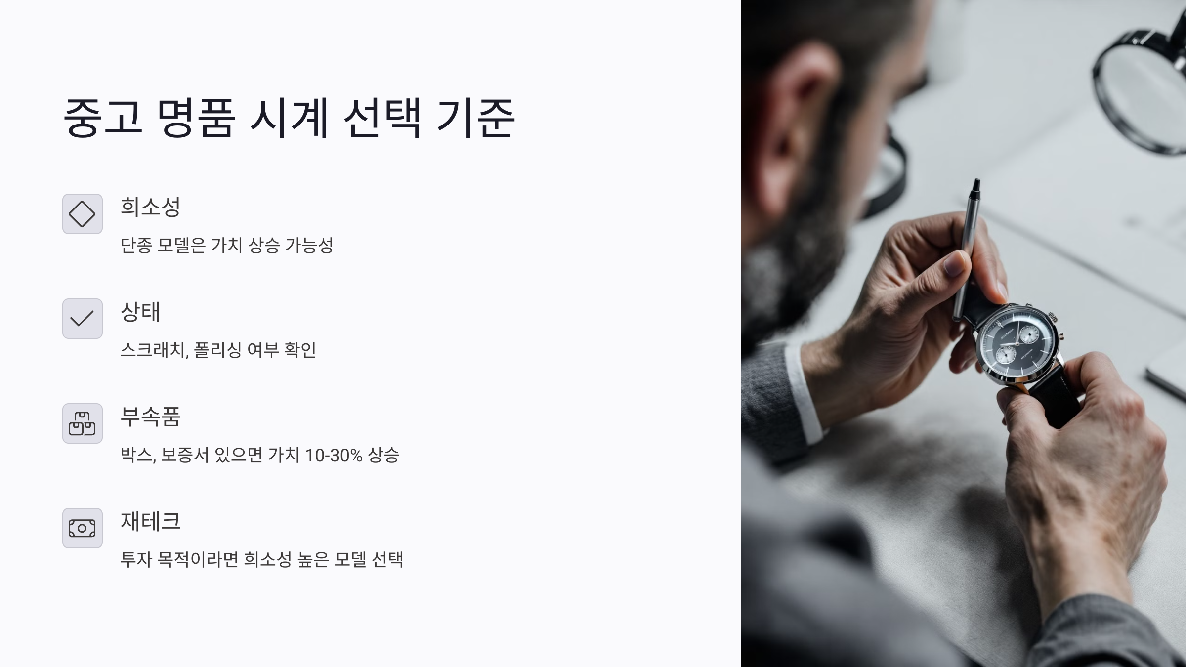 중고 시계를 구매할 때는 단순히 브랜드나 가격만 보고 결정하면 안 됩니다. 각 모델이 가진 희소성, 상태, 부속품 보유 여부까지 함께 고려해야 진짜 '잘 산 시계'가 됩니다. 특히, 최근에는 재테크 수단으로 시계를 선택하는 사람들이 늘어나면서 그 안목의 기준도 까다로워졌습니다.